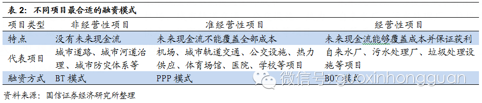 根据融资项目属性不同,可以选择不同的融资模式。政府在BT模式下资金压力较大,适合于未来没有现金流的公共设施项目,如城市道路、防灾体系等。BOO等类私有化的模式可以完全释放资金压力,但是不利于一些公共服务的定价,因此在国内使用的相对较少。当前政府主推的时介于两者之间的融资模式,典型的有BOT和PPP模式,两种模式的主要区别也是政府介入的程度和方式不同,并无明显的优劣。一般来说,BT模式适用于非经营性项目,PPP模式适合准经营性项目,BOT模式适用于经营性项目。