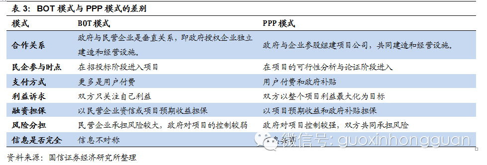 PPP模式和BOT模式对于政府的资金压力较小,因此也成为力推的主要融资模式。这两种融资模式非常相近,差别主要集中于合作关系、民营企业进入时点、支付方式、利益分享、风险分担、融资担保、信息是否完全几个方面。