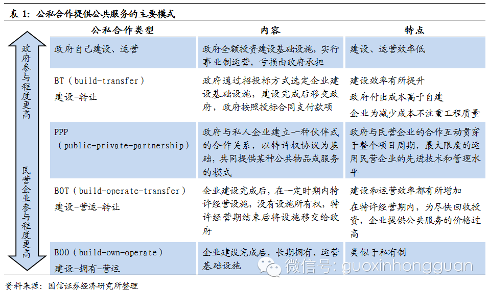 新型城镇化建设带来较大的资金缺口,而地方债务高企下,可供政府资金腾挪的空间有限,因此吸引民营资本成为新型城镇化融资的重要渠道。去年12月的中央城镇化工作会议明确提出,“放宽市场准入,制定非公有制企业进入特许经营领域的办法,鼓励社会资本参与城市公用设施投资运营”。4月2日的国务院常务会议上又确定了吸引社会资本,扩大铁路发展基金,支持中西部铁路建设的措施。这为政府与民营企业合作提供公共服务奠定了政策基础。当前来看,政府和民营资本合作提供基础设施设施具有很多模式,其中主要区别在于政府和民营资本相对参与程度以及承担风险的大小。