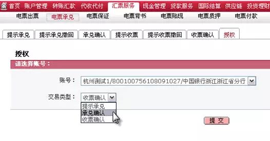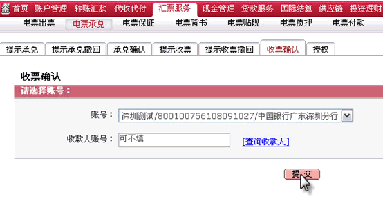 汇票服务→电票承兑→收票确认→提交帐号信息→点击票据号选取交易→提交