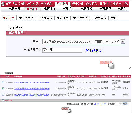 汇票服务→电票承兑→提示承兑→提交帐号信息→点击票据号选取交易→提交