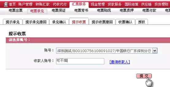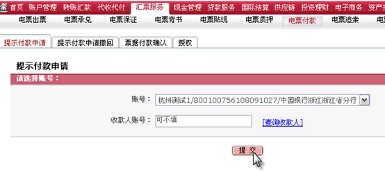 汇票服务→电票付款→提示付款申请→提交帐号信息→点击票据号选取交易→提交