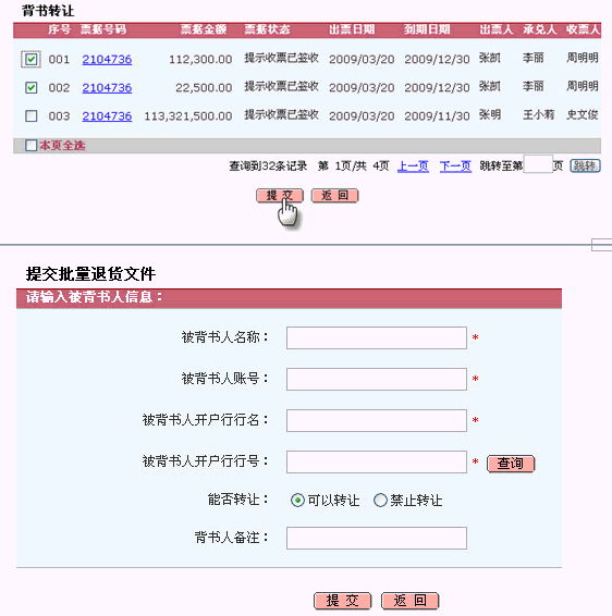 可批量背书,也可单笔点击票号查看票面信息后再进行背书信息填写