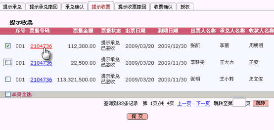 汇票服务→电票承兑→提示收票→点击票据号选取交易→提交