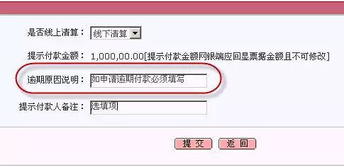 注意:请根据收款行与承兑行的关系来判断清算方式,“线下清算”适用承兑行为于同城中行和接入财务公司的交易,“线上清算”适用于承兑行为异地和他行的交易。如超过票据到期日10天仍未提示付款操作,则须填写逾期原因说明。