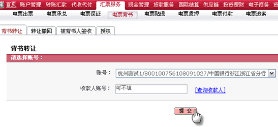 汇票服务→电票背书→背书转让→提交帐号信息→点击票据号选取交易→填写被背书人信息→提交