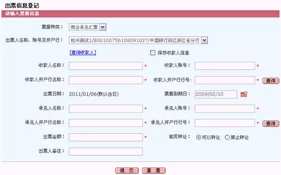 1票据种类:下拉菜单,可选择商业承兑汇票或银行承兑汇票;
