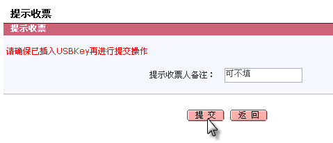 注意:提示收票人备注为选填项,可不填;交易信息将回显在USBKEY的蓝色屏幕上,请确认交易金额等信息后手工摁下USBKEY上的OK键进行提交。
