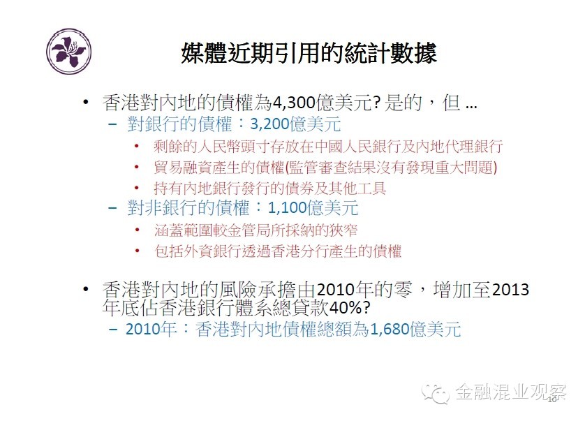观察者言:香港金管局专门就此前财新的报道再次召开通报会。香港金管局副总裁阮国恒表示,香港对内地贷款的增加是可以理解的现象,并以翔实数