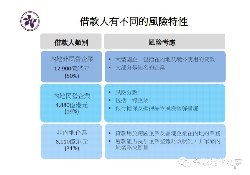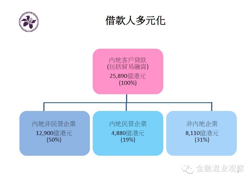 按照借款人划分,包括贸易融资的内地贷款,50%流向大型国企,包括策略性行业如能源行业,民企贷款比例只占19%,剩余为红筹及跨国企业。