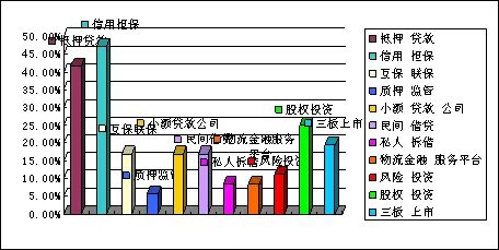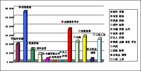 针对“企业更倾向于那种融资方式”这个问题,企业最期望得到的融资方式排在前五位的分别是信用担保、金融服务平台、股权投资、三板上市和风险投资,分别占比为55.6%、36.1%、27.8%、25%和22.2%;而抵押贷款的支持率仅为19.4%,联盟联保、质押监管、小额贷款公司和公积金增资的投票率分别为13.9%、8.3%、2.8%和2.8%。民间借贷和私人拆借则选择率为0。