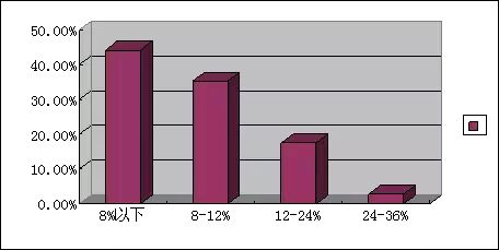 对于合理的融资成本,有44.1%的调查企业希望在8%以下,有35.3%的企业可以接受在8-12%,有17.6%的企业认为最高在12-24%之间,而只有2.9%的企业表示可以适当接受高回报投资。