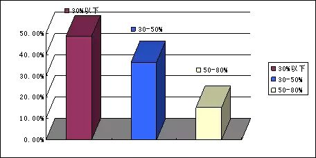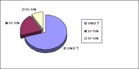 关于企业的负债率,有72家企业都选在30%以下,占全部调查企业的70.6%,负债率在30-50%的企业有21家,占20.6%,而负债率在50%以上的企业仅为9家,占8.8%。