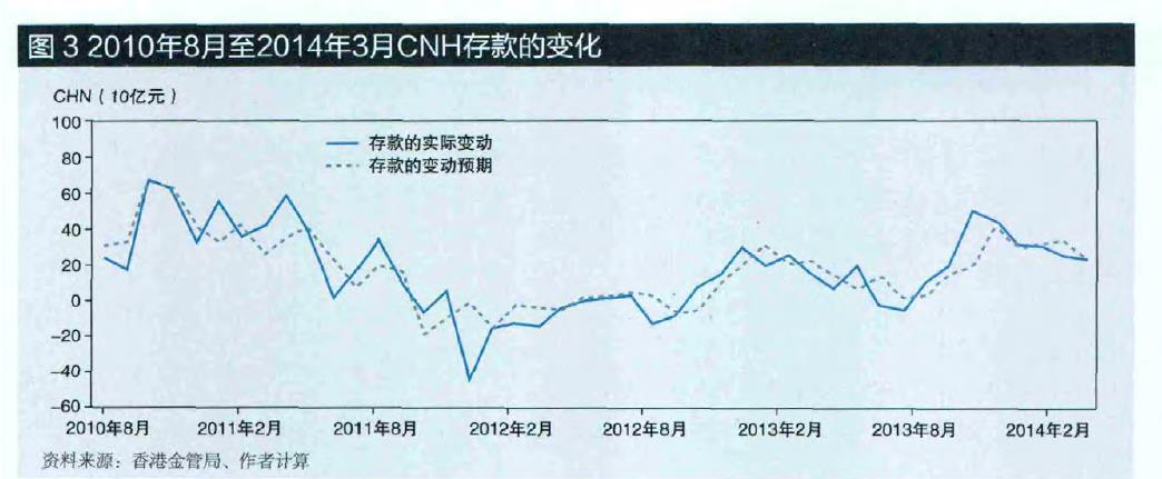 图3显示了CNH存款的变化(实线)和基于上述回归等式的预测值(虚线)。自2012年年底以来,CNH市场出现了以超过模型所预测的速度增长的温和态势,从而增加了随时间推移改良套利的可能性。