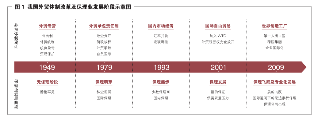中国保理业的发展与我国外贸经营体制发展密不可分,图1展示了我国外贸经营体制演变与保理业发展相关阶段。沿着我国外贸经营体制的发展轨迹,保理业务经历了由“萌芽”阶段向“飞跃及专业化发展”阶段的演变,对促进我国对外贸易的发展发挥了重要作用。