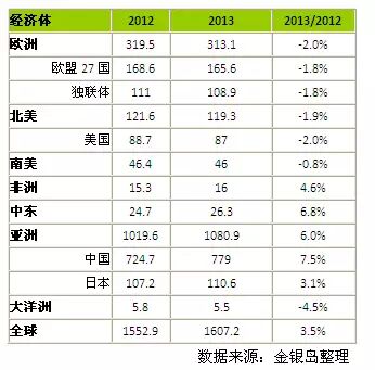 2013年全球粗钢产量达到16.07亿吨,同比增长3.5%,粗钢产量创出历史新高。2013年全球粗钢产量增长主要受亚洲、非洲和中东带动,而其他地区产量均低于2012年。