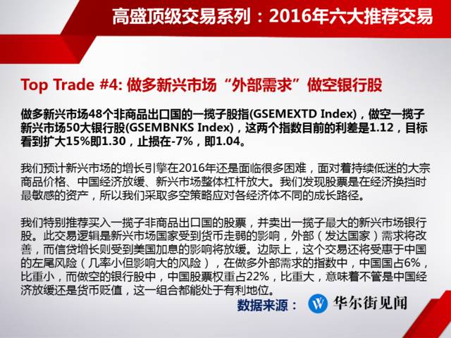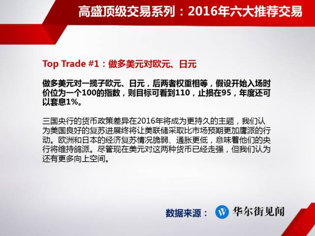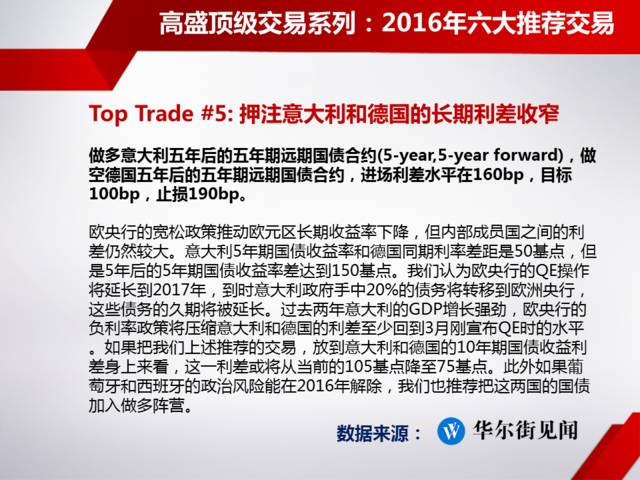 高盛本周四(19日)公布了一年一度的顶级交易(Top Trade)策略,对于即将到来的2016年,高盛看好的交易包括,做多美元对欧元、日元;做多新兴市场大盘,空银行股博相对收益;押注意大利和德国的长期利差收窄等交易。