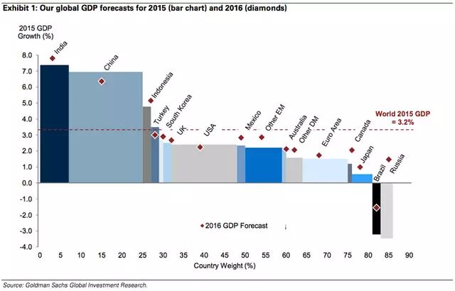 如高盛下图所示,据其预测,明年只有三个国家GDP增速超过上述全球增速,它们是:中国、印度和印尼。