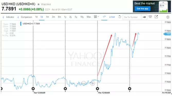 短短两天内贬值超过0.4%,这个幅度对其他货币也许算不上什么。但是香港实行的是完全盯住美元的固定汇率政策(联系汇率制),美元兑港币波动区间为7.75-7.85,波动总空间仅为1.3%。由此看来,0.4%的贬值已经非同小可。
