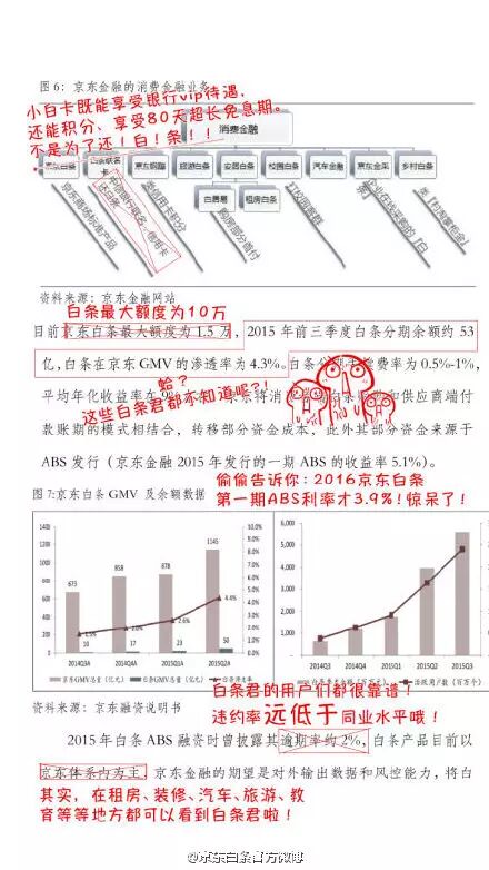 报告提及京东金融&白条时虽未像对其他产品及平台一样,在情况介绍之后加以更多评价,但数据信息的罗列依旧引来京东金融的质疑,今天(3月3日)下午,京东白条官方微博发布一条公告,直指蚂蚁金服的报告内容有误: