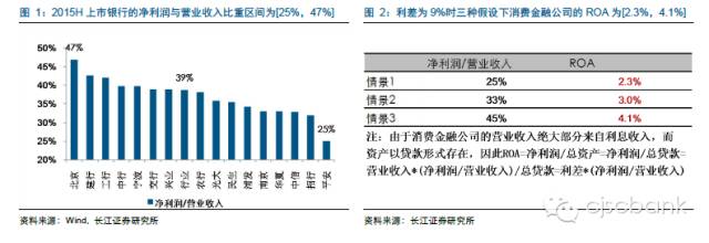 根据2015年上半年的数据,上市银行净利润占营收比重在25%至47%之间,风险偏好越高的银行该比例越低,而经营越稳健的银行该比例越高。由于消费金融业务整体风险相对银行更高,因此我们假设净利润占营收比重为33%(低于上市银行平均值39%),在利差为9%时,其ROA水平是3%,部分公司可以做到4%以上。