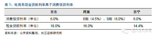 电商系消费金融公司现金贷款和消费信贷利率差别较大,京东、阿里、苏宁消费分期一般在6%左右,而现金贷款则在14%-18%。