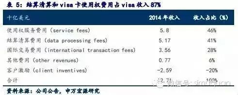 从银行收取的Visa卡使用权服务费用和结算清算收入占总收入的近90%。