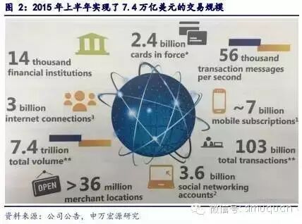 公司与其他机构合作关系良好。公司的网络连接了1.4万家金融机构,有24亿张有效卡,2015年上半年实现了7.4万亿美元的交易规模,1030亿交易量。