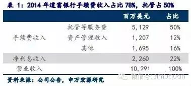 净利息收入占比仅22%。公司为机构客户提供外汇交易、融券以及其他传统商业银行服务。几乎所有的存款都来自于托管业务,投资于货币市场基金,固定收益资产,国债等资产。