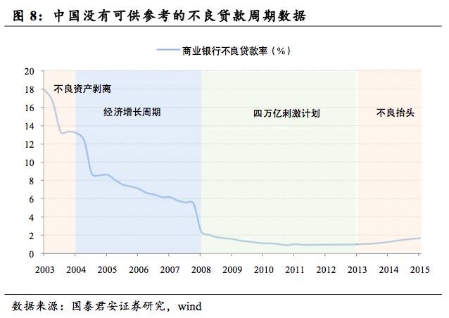 1、研究框架:真实不良率几乎是一个不可知的数据,但这不重要,影响股价的是预期不良率的变化。投资者是基于不良的历史趋势,以及对未来宏观形势和信用市场流动性的预期,间接形成对未来不良率的预期。2、历史回顾:2011年下半年,随着温州中小企业流动性危机爆发,打破了不良率长期低位的态势。2012-2013年间,风险由温州逐步蔓延至浙江、长三角、沿海地区。2014年以后,不良资产在全国遍地开花。不良区域蔓延路径是基本符合产业链上下游蔓延路径的。3、影响因子:未来新增不良率主要取决于三个指标:货币政策条件、宏观经济增速、结构调整进程。目前经济明显下行可能性不大,货币政策转向紧缩的概率很小,新增不良主要来源于结构调整和落后产能淘汰。4、趋势预判:2015年,较早暴露风险的长三角地区出现了不良企稳迹象,中西部不良资产可能要耗时5年以上方能出清。在无其他变量干预情况下,预计中国不良率将在2020年之后见顶回落。5、处置情况:银行加大处置力度,最根本的原因是将不良贷款维持在可控范围内,同时要兼顾拨备覆盖和利润增速。部分上市银行要想保持2016年利润正增长,可能需要降低拨备覆盖率150%的监管要求。现阶段,资产质量仍是银行业最为重要的指标。在账面不良率不为市场信任的情况下,市场更为关心所谓的真实不良率,而这确实又是一个几乎不可知的指标。但影响银行股估值的,其实是市场预期不良率的变化。所以,我们的研究分析,要重点落脚在如何掌握市场的预期不良率的变化上。不良率是评价银行资产质量最重要的指标。但是,不良率又是一个经济周期的滞后指标和钝化指标,银行股股价基本同步于经济周期。因此,很难用不良贷款预测银行股股价变动。- 从企业角度讲,企业无力偿还贷款本息是滞后于盈利恶化的。经济周期下行后,起初企业收入开始下滑,但仍能偿付银行贷款的本息。随着下滑加剧,才会逐渐出现企业无法偿付贷款本息的情况,也就是产生不良贷款。