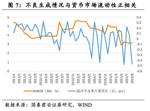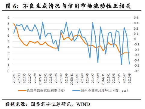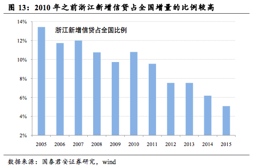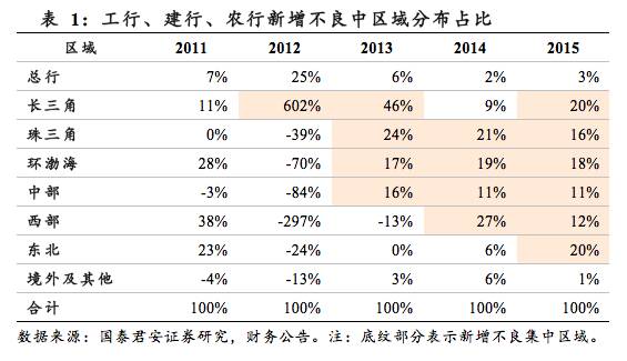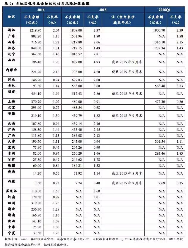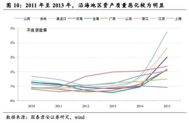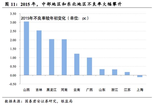 温州爆发危机后,在2012-2013年间,浙江其他地区(如绍兴、宁波、杭州等)也出现类似的情况,由于各地杠杆率不同、支柱产业出现恶化时间不一,浙江其他地区出现问题的时间略有先后,但危机爆发过程基本类似,都是企业出现流动性问题,风险通过互保链蔓延,区域内发生信用危机。2012年浙江省不良率明显恶化,较年初上升77bp至1.68%。2012年开始,江苏、上海等沿海地区的中小企业信贷质量出现恶化。由于钢价下跌,上海等地钢贸出现大量不良;国内产能过剩、外贸内需不振等多重因素,江苏等地光伏行业信贷质量也出现恶化。与浙江不同的是,由于江苏、上海等地企业规模较大、产业多元化,风险多呈现行业性而非区域性,区域不良余额和比率均低于浙江。 2014年以后,银行不良从沿海地区向内陆地区蔓延,不良资产在全国遍地开花。从工行、建行、农行新增不良中区域分布占比数据看出,2011年至2013年,长三角是不良的主要生成区域,2014年和2015年,中西部、东北地区风险逐步暴露。从2015年的不良率数据可以看出,较早暴露的长三角地区出现了不良企稳甚至下降趋势,但中西部地区开始上升较快。2015年,中部地区、东北地区和西南地区不良率大幅攀升,山西、吉林、黑龙江、河南等省不良率上升2-3pc。而2015年、2016Q1浙江省不良率仅上升0.33pc、0.02pc,2015年江苏省不良率仅上升0.18pc,2015年、2016Q1上海不良率下降0.11pc、0.05pc。不良区域蔓延的路径,基本符合产业链上下游蔓延路径。长三角地区以中小企业为主,大多生产消费品和小型工业用品,属于下游行业;中游以重化工业为主,上游主要是资源型行业,中上游大多数企业集中在内地。在经济下行阶段,需求走软,终端消费品和工业用品最先受到冲击,而后风险向中上游蔓延。一是信贷周期中产生不良。即银根放松,金融机构过度信贷,催生泡沫,银根收紧时,由于借款周期与用款周期不匹配(企业申请长期贷款难度较大,通常存在短贷长用的现象),资金链断裂。典型的代表是温州危机和钢贸贷款。二是经济周期中产生不良。经济繁荣阶段,企业扩大经营规模。经济下行阶段,外贸内需不景气,需求走软,企业经营恶化。典型代表是光伏、钢铁、煤炭等行业。由于信贷周期和经济周期往往是相生相伴的,大多数企业贷款风险会同时面临以上两种情况。经济景气时,企业盈利状况好,银行愿意多投放信贷,企业加杠杆扩规模;经济不景气时,企业经营恶化,银行倾向于谨慎投放,甚至压缩某些行业信贷,加重企业流动性风险。信贷周期导致不良的典型代表是温州危机。2005-2010年间,浙江省是信贷资源重点倾斜的领域,新增信贷占全国比例基本保持在10%左右,但GDP占比基本维持在6-7%之间,导致当地杠杆率偏高。另外,民间过桥借贷参与度广。2011年二季度温州中心支行调查显示,民间借贷参与规模首次超越房地产、股票、基金等投资方式,温州已有89%的家庭个人、59.67%的企业参与民间借贷。过度信贷用于投机领域导致的危机,多集中在长三角地区,往往以一种剧烈的方式爆发。其他地区杠杆率没有长三角地区高,信贷资金用于投机的比例也较低,企业往往由于经营恶化导致信贷资产质量恶化,银行能够通过贷后管理获得提前预警,因此这类不良恶化趋势会比较温和。由于经济不景气导致的资产质量问题,预计仍会不断恶化。这类不良未来的趋势,主要取决于三个指标:- 货币政策条件:货币宽松能够缓解银行资产质量问题。原因有三方面,第一是引导市场利率下行,减轻企业债务负担;二是宽松货币后,货币实际购买力下降,债务人真实债务负担下降,利于改善银行资产质量;三是企业的信贷可得性提高,再融资难度减小。目前经济仍不景气,预计货币政策转向紧缩的可能性很小,将维持宽松。