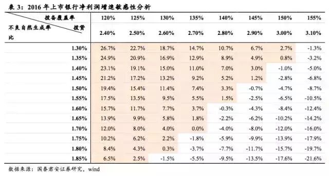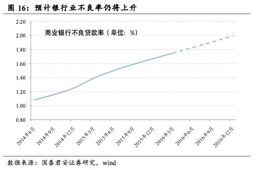 - 一般假设:我们预计2016年不良自然生成率可能升至1.50%左右,上市银行拨备覆盖率或降至145%左右。