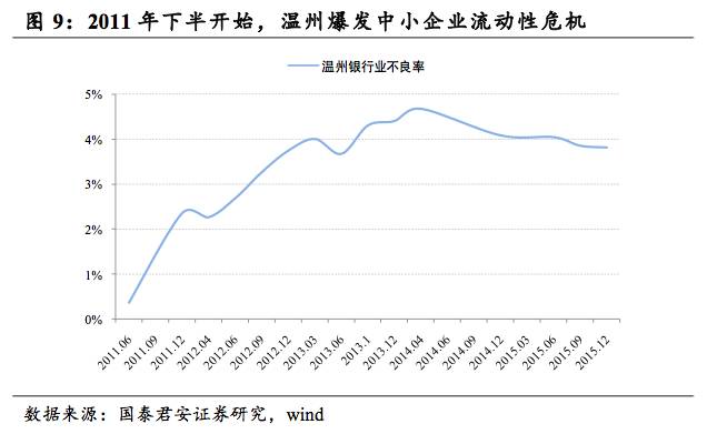 - 2010年和2011年的房地产调控和收缩银根使银行信贷投放趋于谨慎。2011年下半年,温州企业资金链和信贷担保链断裂,并以圈层形式递进,温州信贷危机爆发。温州银行业不良率从2011年6月末的0.36%激增至2014年4月末的4%以上,当地银行机构出现亏损,回吐往年利润。
