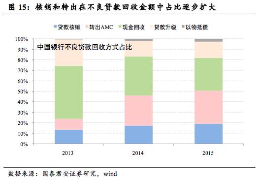 我们认为长三角地区的信贷资产质量已经度过了最糟糕的时期,预计在未来1年左右将企稳。最先出现问题的温州地区用了约3年时间不良见顶,2014年率先出现不良双降。长三角等地在消耗钢贸、光伏等行业不良后,很少有意外新生的不良。2015年上海不良率开始下降,浙江地区不良率仍在上升,但预计将在未来1年左右企稳。 预计中西部重化工业、资源型行业不良资产可能要耗时5年以上方能出清。长三角不良率大约耗时4年左右才见顶回落,由于中上游企业规模较大、国企偏多,出清速度慢,预计中西部和东北地区将耗时更久。按此估计,在无其他变量干预情况下,中国不良率将在2020年之后见顶回落,除非政策上主动加快出清。在宏观经济下行的背景下,不良率继续上行是大概率事件,因此银行仍需要投入大量资源用于清收处置不良。这是因为,一来这是满足监管的需求,二来表内有大量的不良将影响银行的信贷投放能力。清收,是指采取多种手段,包括诉讼、变卖抵质押品、履行担保等手段,尽可能完整地收回所欠本息。对于清收难度极大的不良,则需加快处置,主要方法包括核销、转让给AMC、资产证券化、债转股。①核销:即会计上注销该笔不良,同时也相应注销所计提的贷款损失准备(拨备)。银行核销不良资产的动机并不强。- 根据不良资产核销的有关规定(财政部、税务总局等),银行在核销不良时要收集一系列证据,证明该贷款确实是难以收回,因此操作成本和时间成本较高。