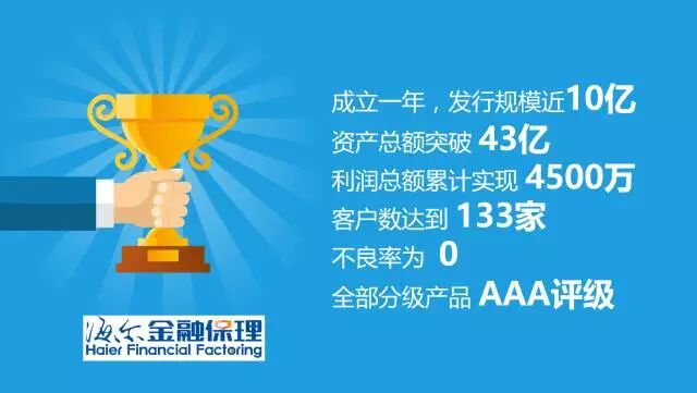 海尔金融保理(重庆)有限公司是海尔金控的全资控股子公司,是首批落户重庆两江新区的金融保理优秀企业。自2015年5月28日正式注册成立以来,在海尔集团及金控平台的全力引领下,在重庆市政府及两江新区的大力支持下,在前民生银行保理部总经理蔡厚毅先生和创业团队的共同打造下,从无到有,不断拓展,努力创新,短短一年取得了骄人的经营成绩。截至2016年5月末,公司资产总额突破43亿,利润总额累计实现4500万,客户数达到133家,不良率为零。发展水平远高于保理同业平均水平,成为保理界迅速燃起的一颗新星。