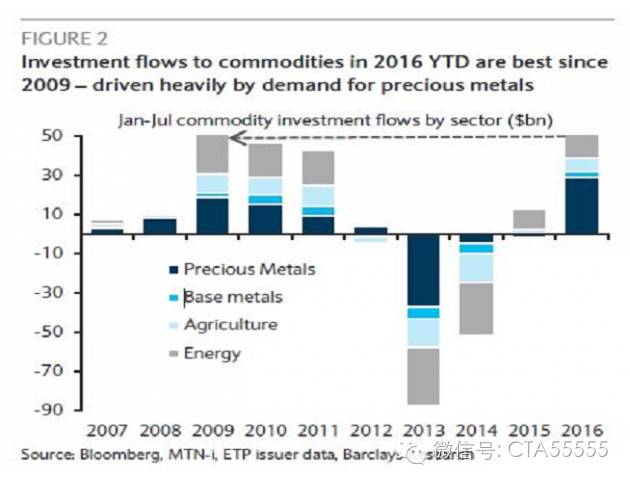 原因之一就是,大部分资金流动反映出了英国脱欧公投所引发的市场避险需求以及市场对美国总统大选政治局势的不安。在今年大宗商品资金流入中,其中贵金属方面的资金流入占近60%。黄金显然主导着这些资金的流入。
