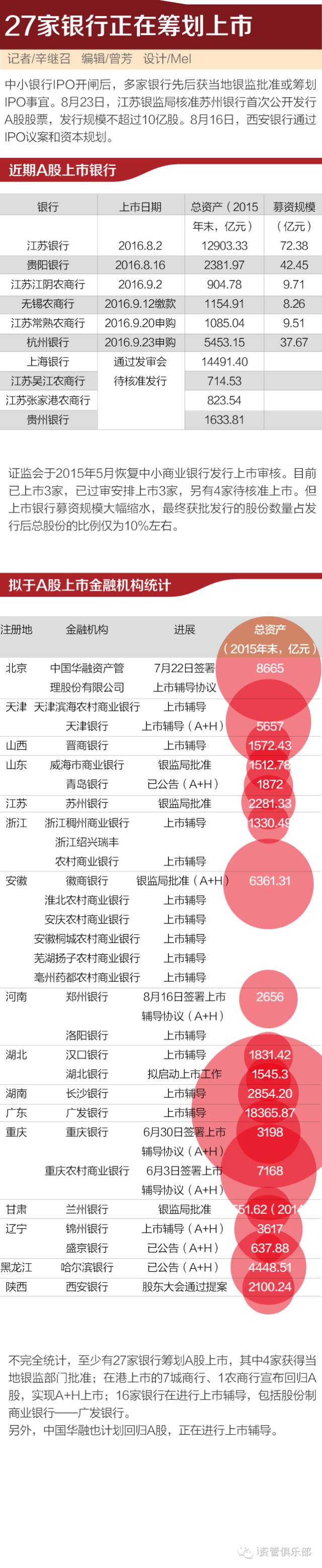 来源: i资管俱乐部(ID:amcfeed) Bank资管整理2016年9月9日,证监会公告称,按法定程序核准了14家企业的首发申请,其中,包含拟在上交所上市的杭州银行股份有限公司(600926)。2015年12月30日,杭州银行通过证监会发审委审核;2016年9月23日是杭州银行的申购日。早在2007年,杭州银行就申请过上市,但因城商行上市暂停,因此一等就是十年。这十年间,杭州银行的发展势头一直不错,但终究被已经上市的其它城商行甩在了身后。上市除了品牌效应,还可补充资本金,在过去银行业发展的黄金十年,杭州银行可谓错失良机。时隔九年,城商行上市的闸门在今年重新打开。面对资产规模扩张、利润增长乏力、不良高企等难题,城商行和农商行面临着急切的资本补充需求,上市则是银行最好的资本补充方式。9月2日,江阴银行在深交所正式挂牌,这意味着农村商业银行A股上市实现零的突破;在此前的8月2日,江苏银行登陆上交所,成为最近9年来第一家叩开A股大门的城商行;贵阳银行也在8月16日紧随其后。9月12日,杭州银行相关人士对21世纪经济报道记者表示,上市对公司正面影响更大,除自身发展外,更受益于杭州当地及浙江区域优势。G20的举办极大促进了杭州的经济发展,以基础设施建设拉动为甚,杭州已经连续五个季度GDP增速保持在两位数区间,远超同期全国和全省的水平。但过分倚重杭州的弊端(杭州地区贡献了杭州银行的大部分利润)也显而易见,一旦发生区域性风险,杭州银行受到的冲击更大。上市后还将造就一批杭州银行内部员工“富翁”。招股说明书显示,截止到2015年6月30日,杭州银行持有该行5万股以上的内部职工股股东人数为431人。杭州银行发行价最高