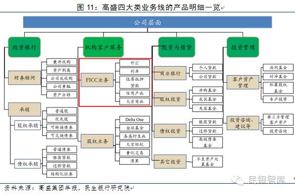 FICC业务对于现代投资银行功能发挥的意义在于可以为不同类型的客户提供流动性和风险管理功能,满足客户在利率、汇率、商品市场的多样化投融资需求。高盛FICC业务主要是做市(market-making)业务,下设五条产品线,分别是:利率类(Interest rates)、证券化类(Mortgages)、货币/外汇类(Currencies)、信用类(Credit)以及商品类(Commodities)。