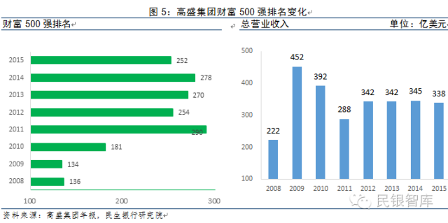 金融危机在很大程度上改变了国际投行业的发展轨迹。高盛集团的经营数据,也从侧面表明全球投行业与全球经济一样正在经历经济低迷、调整和适应期。根据财富500强榜单(以总收入规模计),高盛2009-2016年排名有所下滑,但2011年后相对平稳。