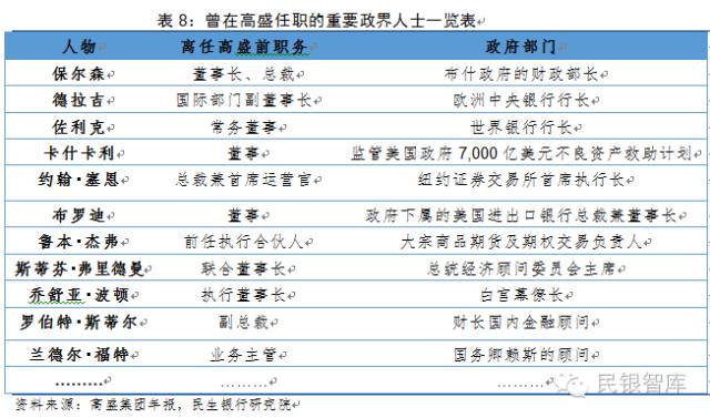 在欧美政界,高盛具有广泛而深厚的人脉,这其中的典型事实是大量高盛前雇员都在政府重要职位任职,这为其业务拓展和日常运营提供了良好便利。这从深层次证明高盛非常注重政府这个重要客户群体的经营。