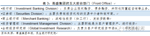 在高盛内部,五大前台部门分别是投行部、证券部、商业银行部、投资管理部、全球投资研究部,这些部门共同组成了服务客户的四大业务条线。(1)投资银行:向由企业、金融机构、投资基金和政府组成的多元客户群体提供广泛的投资银行服务,具体是指就合并和收购、资产出售、企业反收购活动、风险管理、重组和分拆、公开发售和私募配售的债券和股票承销(包括国内交易和跨境交易),以及与这些活动直接相关的衍生工具交易提供策略咨询服务。(2)机构客户服务:与企业、金融机构、投资基金及政府等机构客户合作,促进客户交易,并在固定收益、股票、货币和商品市场提供做市服务;向遍布全球的主要股票、期权及期货交易所提供做市服务,并向机构客户提供融资、证券借贷及其它机构经纪服务。(3)投资与借贷:通过投资与贷款向客户提供长期性质融资;通过管理的基金直接或间接投资于债务证券及贷款、上市及私募股权证券、房地产、综合投资实体及发电厂。(4)投资管理:向众多机构和个人客户提供横跨所有主要资产类别的投资管理服务和投资产品(主要通过独立管理账户及集合投资工具,例如共同基金和私募投资基金);向高净值个人和家庭提供理财顾问服务,包括投资组合管理和财务顾问,经纪和其它交易服务。