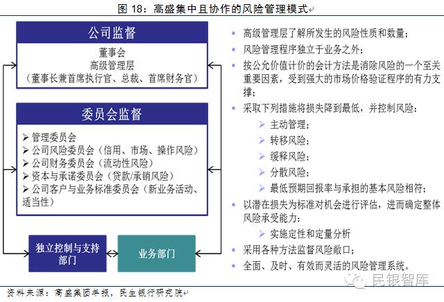 组织层面,董事会领导下的各类风险控制与业务委员会在高盛公司风险管理中处于核心地位。与风险相关的委员会包括管理委员会、公司风险委员会、部门风险委员会、资本承诺委员会等。在董事会领导下,高盛保持对风险的高度关注:如董事会定期审核并批准公司的风险情况,包括公司的财务杠杆、流动性风险和其他事务;董事会定期审核具体的风险分析,例如压力测试和情景分析等;除了正式的常规记录之外,董事会还定期与风险控制和业务部门的众多其他高管进行沟通。