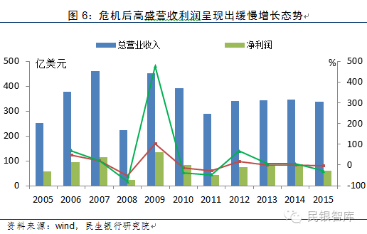 金融危机在很大程度上改变了国际投行业的发展轨迹。高盛集团的经营数据,也从侧面表明全球投行业与全球经济一样正在经历经济低迷、调整和适应期。根据财富500强榜单(以总收入规模计),高盛2009-2016年排名有所下滑,但2011年后相对平稳。
