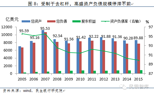 主动去杠杆。为满足巴塞尔协议III等外部监管的要求,控制经营风险,以美国投行为代表的金融机构都纷纷加速去杠杆,境外投行的经营杠杆都从危机前约30倍的水平下降至2015年约10倍左右的水平,其中高盛的杠杆比例从2007年高峰时期的26.2倍下降至2015年约10.3倍的水平。全美证券经营机构的杠杆比例从2007年高峰时期的38倍下降至2015年约18倍左右的水平。由于监管发生了变化,高盛需要更多资金,以实现去杠杆化。从下图可以看出,高盛通过内源积累和外源补充,资本金实力得以提升,“去杠杆化”成效显著。