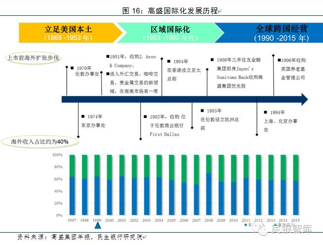 高盛集团的国际化进程先后经历了起步阶段(1869-1953年)、进军欧洲和日本(1953-1980年代)、金砖四国与新兴市场的战略性扩张(1984-2015年)等阶段。在此过程中,高盛国际化经营程度逐步提高,从立足美国本土到区域国际化再到实现全球跨国经营。现如今,高盛集团海外收入占比约为40%,并且连续保持20年以上,俨然成为国际金融业全球化发展的典范。