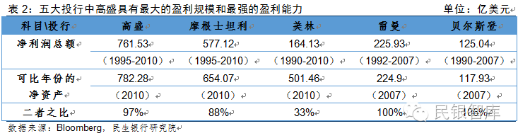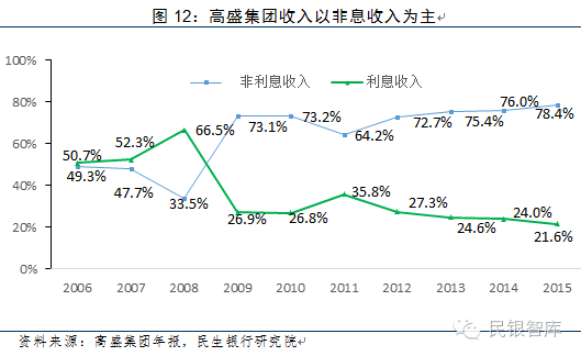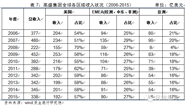 后危机时期,国外投行纷纷借助多元化发展来提升抗周期能力,应对盈利下滑的压力。很多金融机构改变了商业模式,部分机构开始从事零售业务或者从国际扩张转向国内市场。但是高盛并没有改变核心战略,其仍然专注于投资银行业务,仍主张全球化运营。