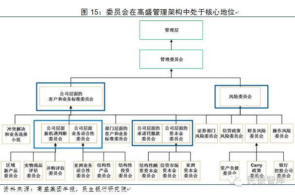 管理层下管理委员会、公司风险委员会、部门风险委员会、资本承诺委员会、信用政策委员会、创新产品评审委员会、操作风险委员会、财务委员会等各种委员会,各委员会起到了“核查和平衡”的重要作用。在管理程序上,最高层是以董事长(兼CEO)和首席运营官为首的建立了一个由6个人组成的执行委员会,从全局上进行统筹管理,不代表任何特定部门的利益。在执行委员会之下,包括经营和合伙人委员会。新成立的执行委员会的成员来自每一个部门,他们将介入整个公司的运营。同时,更多的合伙人将会清楚地了解公司的运营和长期战略。由于有更多的合伙人能够接触到上层的管理,公司的文化能够从领导者那里轻易地传递给更多的人。