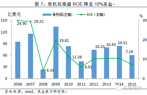 受全球经济弱复苏和监管趋严的影响,高盛近年来面临较大的增长压力。盈利能力明显下降,营业收入缓慢增长,资产负债规模的停滞不前。以2015年为例,高盛实现营业收入338亿美元,同比下降2%,净利润约61亿美元,同比下降约28%,ROE更是首次跌破两位数,降至7.14%的水平,其中机构客户服务和投资借贷是业绩下滑的主要业务点。据最新的财务数据,高盛2016年上半年营收为142.7亿美元,同比下降27.51%;净利润下降24%,至29.6亿美元。受制于去杠杆和盈利能力下降,高盛股价估值出现了明显下滑,相比危机前,PE估值和PB估值均下降70%以上。
