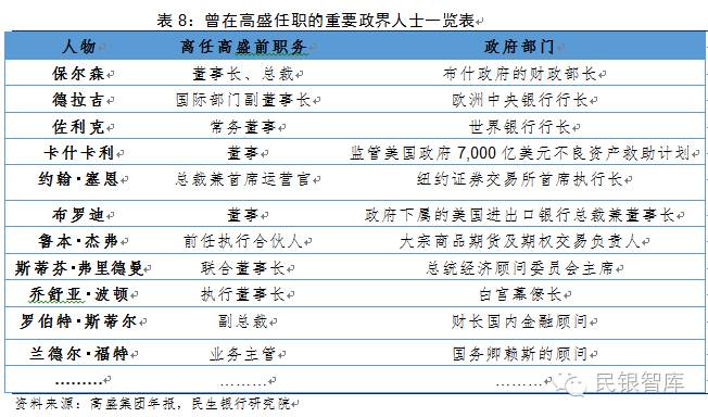 在欧美政界,高盛具有广泛而深厚的人脉,这其中的典型事实是大量高盛前雇员都在政府重要职位任职,这为其业务拓展和日常运营提供了良好便利。这从深层次证明高盛非常注重政府这个重要客户群体的经营。