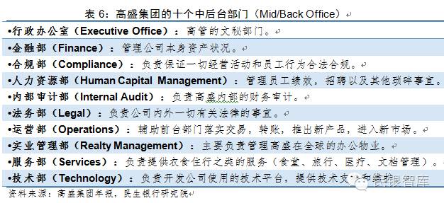 截至2015年底,高盛集团员工人数约为3.68万名,其中2/3以上的员工属于中后台员工,高盛集团深知,只有中后台的强大才算真正强大。为此,高盛集团在中后台进行大量投入,以IT为例,高盛的后台仅IT支持人员就占到员工总人数的约1/3,除此之外,还有大量的中台人员,以及身处前台的支持人员;高盛的IT部门甚至开发自己的算法和语言。强大的中后台为前台高效运转提供了有效保证。高盛迄今已经存在了近150年,之所以能够在大风大浪中屹立不倒,不仅是因为高盛的业务优秀,而且是因为高盛的中后台同样优秀,后台与前台一样强,甚至比前台更强。
